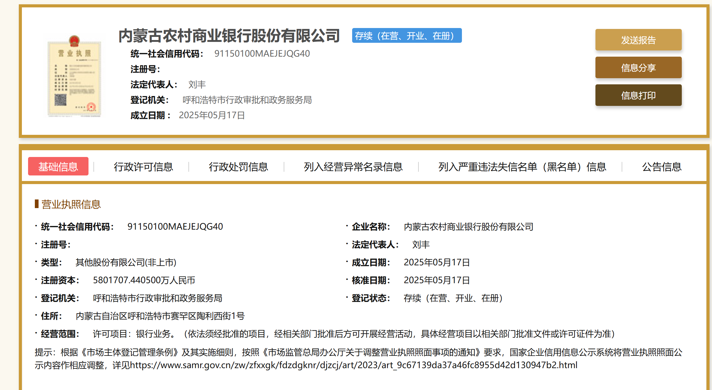 工商资料显示,内蒙古农村商业银行股份有限公司(简称“内蒙古农商银行”)成立于2025年5月17日,法定代表人刘丰,注册资本580.17亿元人民币。根据公开资料,截至2024年底,内蒙古农信系统资产规模8833亿元。