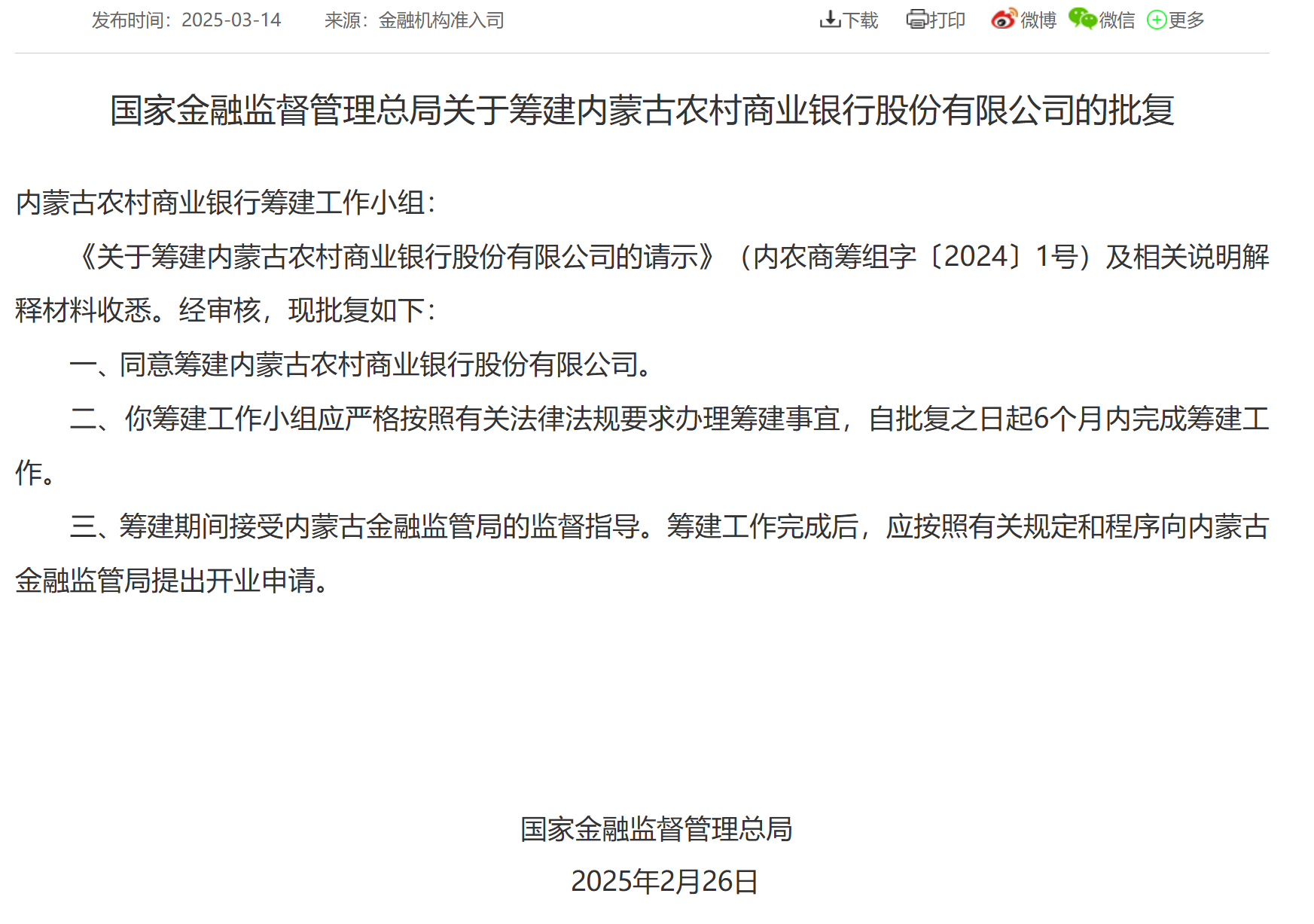 国家金融监督管理总局发布批复同意筹建内蒙古农商行。国家金融监督管理总局官网截图