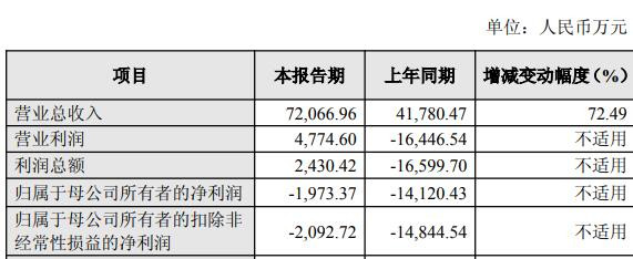 据公司2025年度业绩快报公告,报告期内,公司实现营业总收入7.21亿元,同比增长72.49%;归属于母公司所有者的净利润-1973.37万元;归属于母公司所有者的扣除非经常性损益的净利润-2092.72万元。