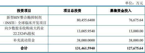本次发行募集资金总额不超过(含)127,675.64万元,扣除发行费用后的募集资金净额将用于新型HIV整合酶抑制剂(INSTI)全球临床开发项目、向少数股东收购南大药业22.2324%股权、补充流动资金。